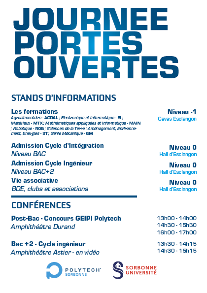 Cette Journée Portes Ouvertes est l’occasion idéale de découvrir l’environnement d’apprentissage, les formations et la vie étudiante à Polytech Sorbonne. Tout au long de la journée, les équipes pédagogiques et les étudiants seront mobilisés pour vous accueillir, vous informer et échanger avec vous.